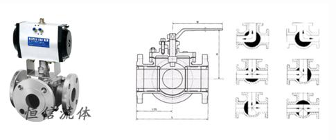 三通球閥分L型和T型,介質流通方向見下圖。L型三通球閥適用于介質流向的切換,能使相互垂直的兩個通道連通:T型三通球閥適用于介質的分流、合流或流向切換,T型孔道可以使三個通道互相連通或使其中兩個通道連通,三通球閥一般采用兩個閥座結構,亦可根據用戶要求采用四閥座結構。
